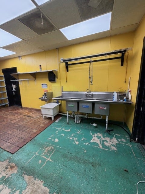 Kitchen features walk-in cooler, hood and fire suppression system, utility, mop and hand sinks. Gas line installed. No equipment.